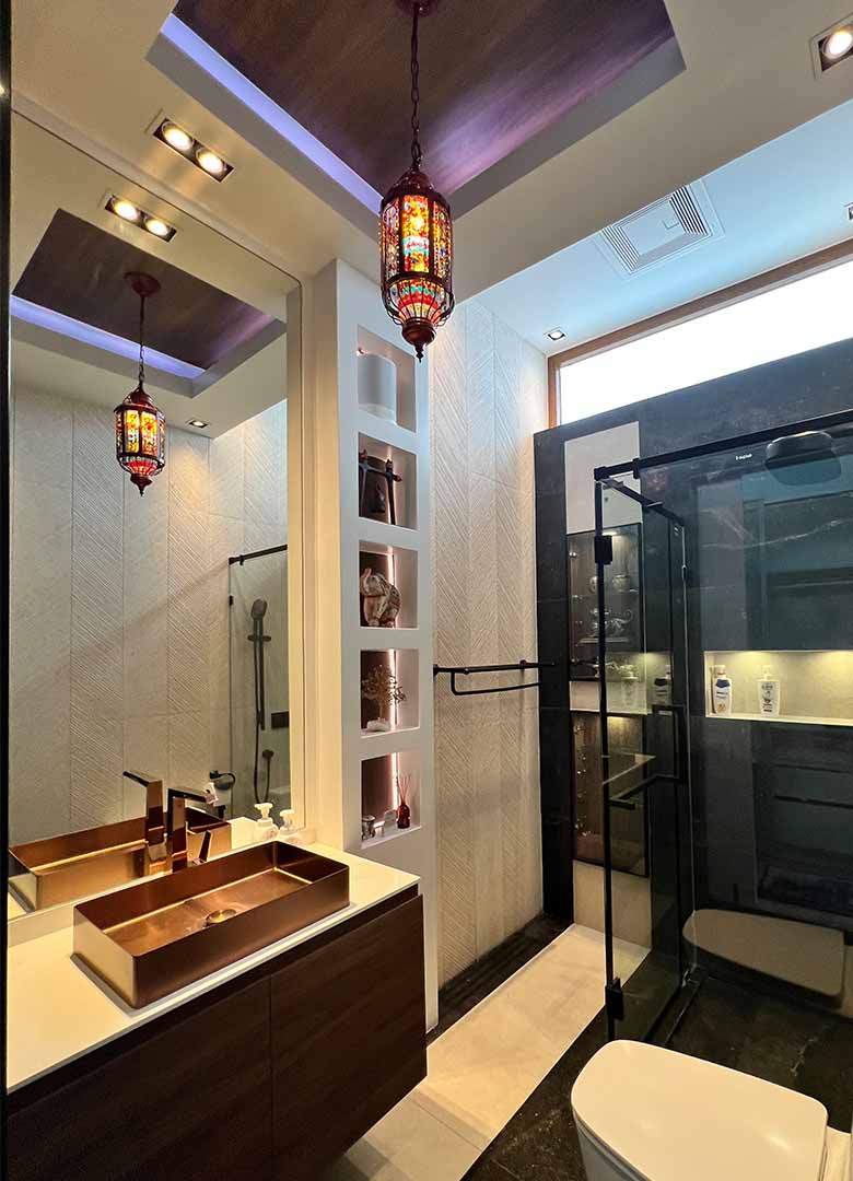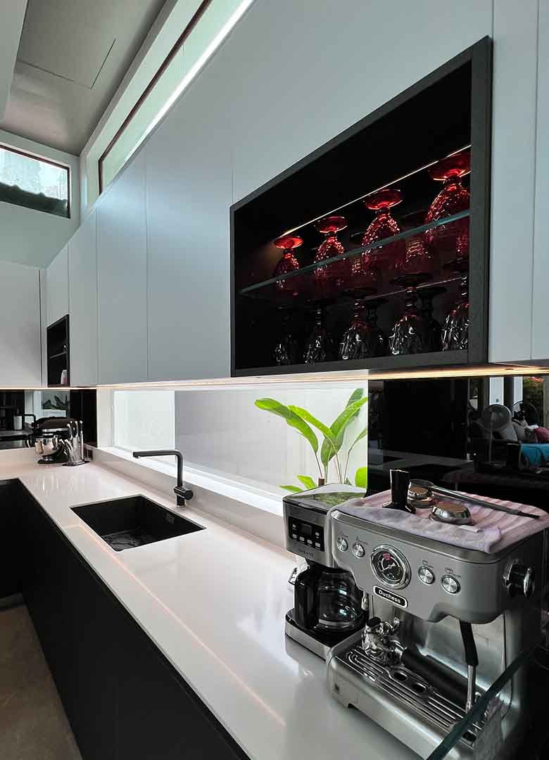 The kitchen is functional with a simple and sleek design, white and dark gray. The guest Bathroom is modern with a Mediterranean mood, warm and stylish.