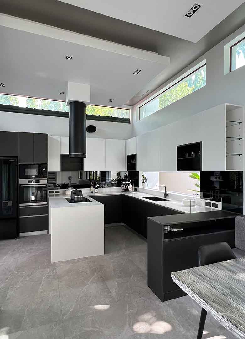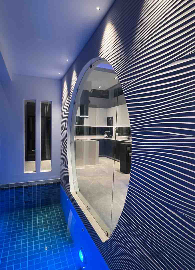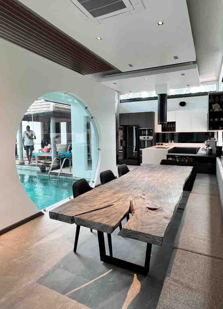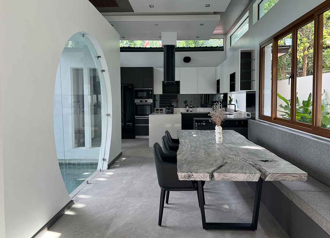 The kitchen and dining areas have been completely renovated with a separation from the pool with a new wall with a large circular glass window, externally covered with 3D Spanish ceramics by Porcelanosa.
