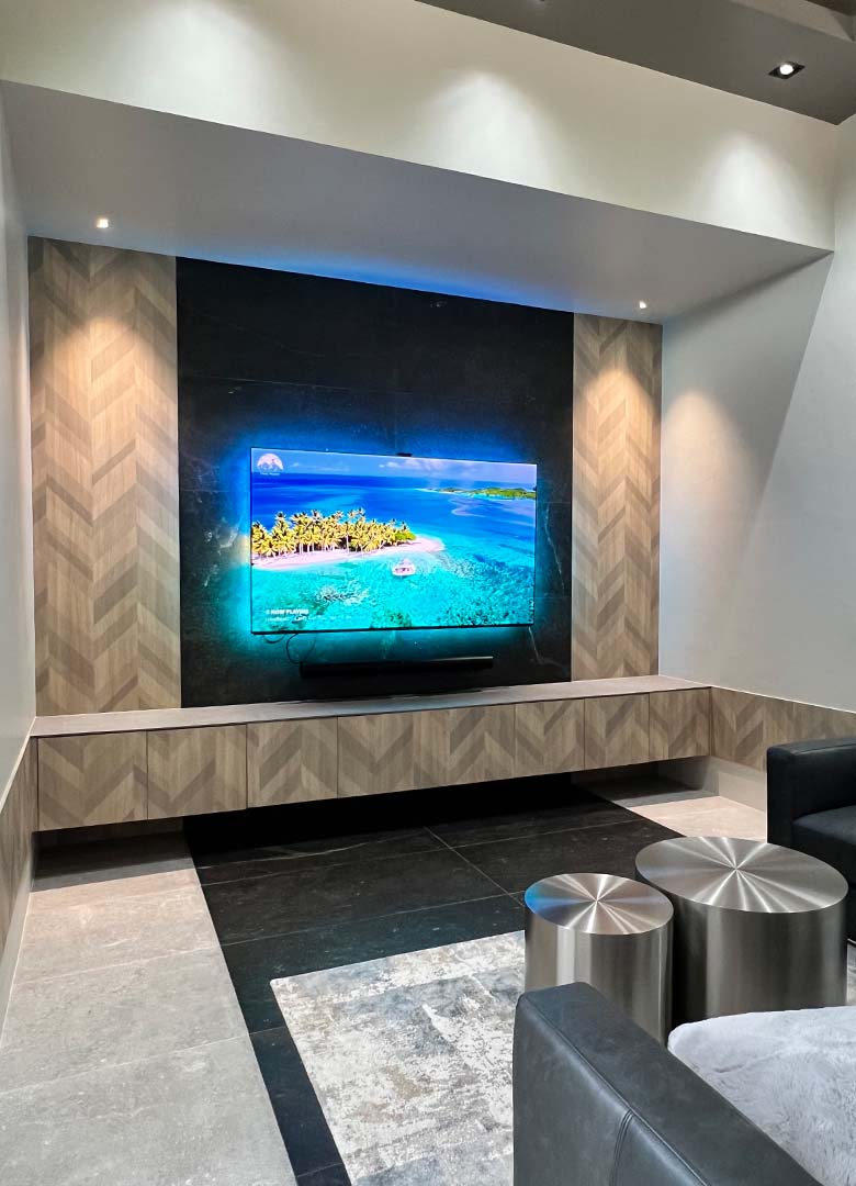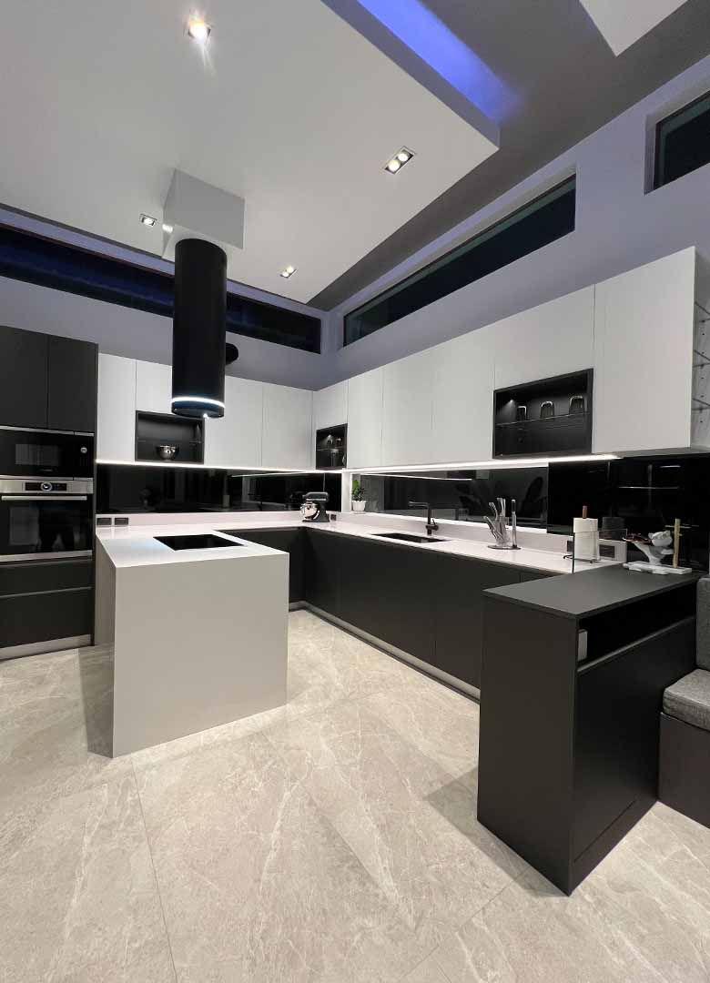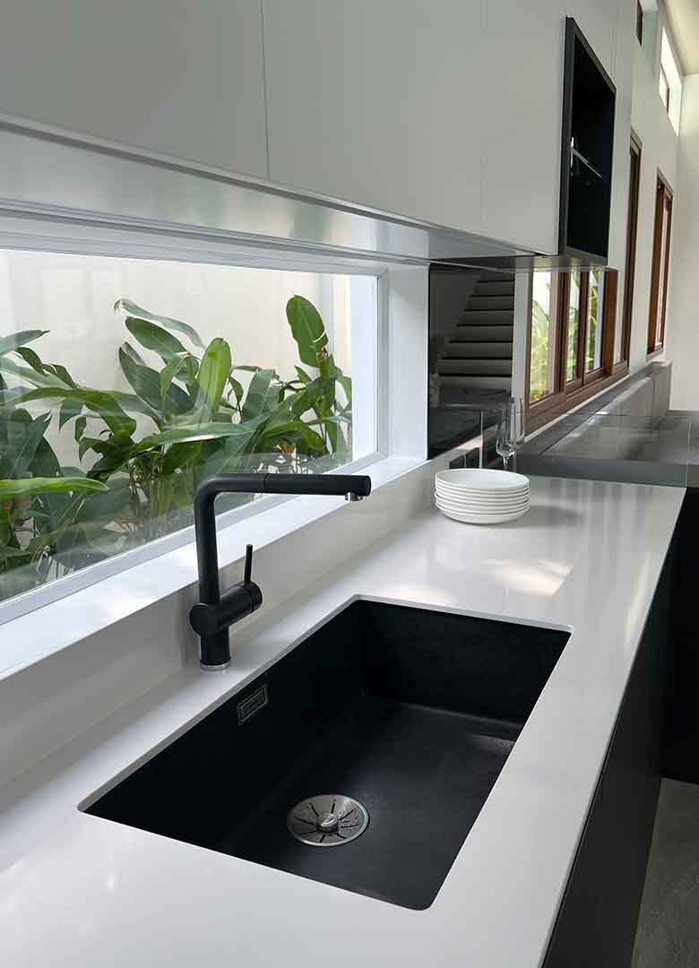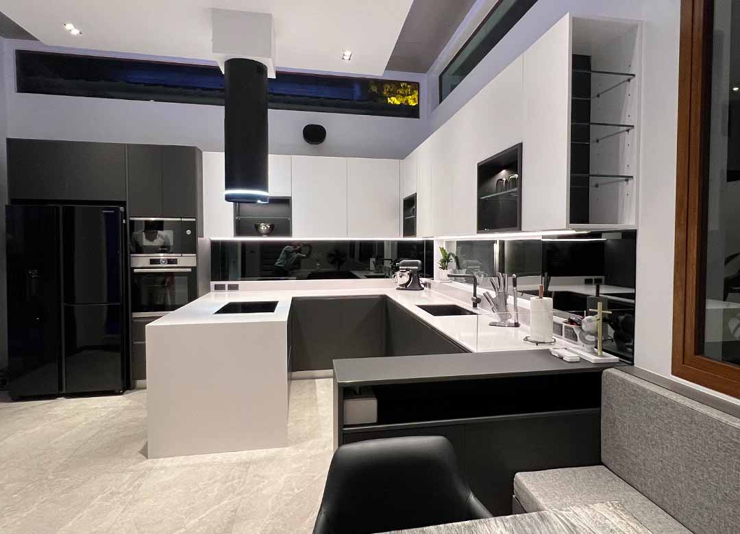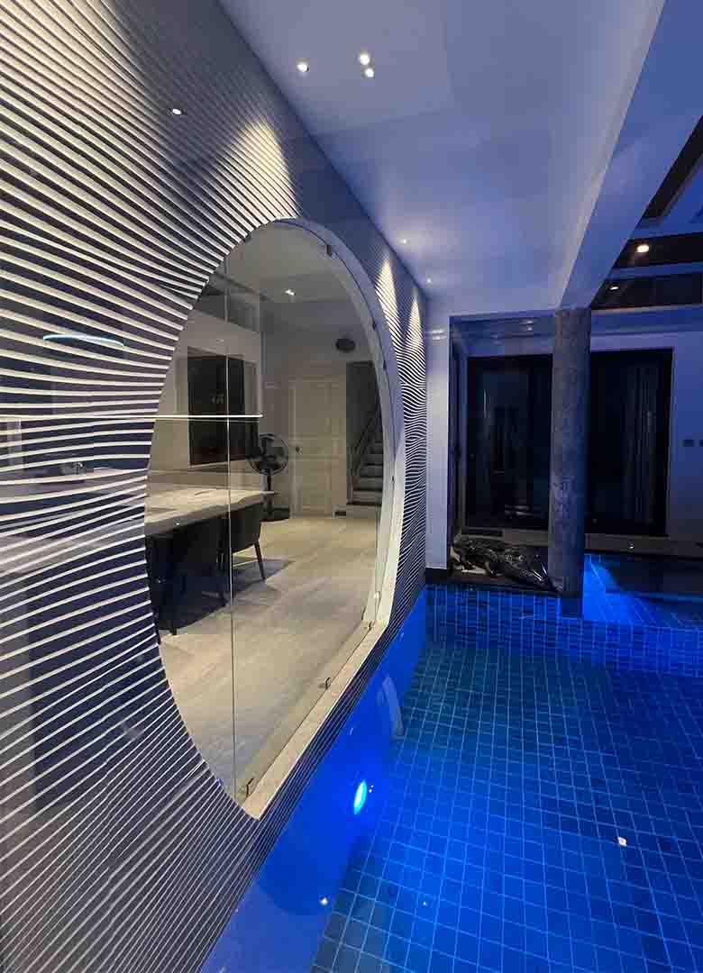 The kitchen and dining areas have been completely renovated with a separation from the pool with a new wall with a large circular glass window, externally covered with 3D Spanish ceramics by Porcelanosa.